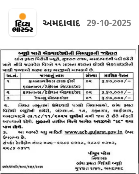 લાંચ રૂશ્વત વિરોધી બ્યૂરો દ્વારા જાહેરાત માં 29 ઓક્ટોબર 2025 ના રોજ બહાર પાડવામાં આવી છે. આ ભરતી માટે અરજી કરવાની અંતિમ તારીખ 18 નવેમ્બર 2025 નિશ્ચિત કરવામાં આવી છે. જો તમે આ શાનદાર તકનો લાભ લઈને ભરતી પ્રક્રિયામાં સામેલ થવા માગતા હો, તો અમારી નમ્ર સલાહ છે કે તમે નિર્ધારિત સમયમર્યાદા પહેલાં તમારી અરજી તૈયાર કરીને સબમિટ કરી દો, કેમ કે એકવાર છેલ્લી તારીખ વીતી ગયા પછી કોઈપણ પ્રકારની અરજીઓને માન્યતા આપવામાં આવશે નહીં.