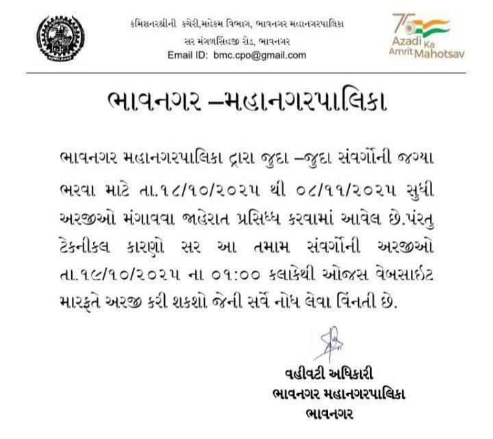 Bhavnagar Municipal Corporation Recruitment: ભાવનગર મહાનગરપાલિકા દ્વારા વિવિધ પદો પર સ્ત્રીઓ તથા પુરૂષો માટે ભરતી જાહેર