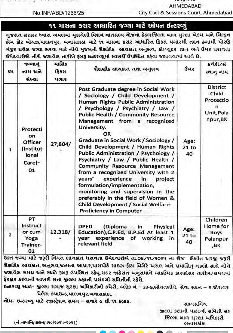 જિલ્લા બાળ સુરક્ષા એકમ દ્વારા જાહેરાત માં 29 ઓક્ટોમ્બર 2025 ના રોજ બહાર પાડવામાં આવી છે. આ ભરતી માટે અરજી કરવાની અંતિમ તારીખ 06 નવેમ્બર 2025 નિશ્ચિત કરવામાં આવી છે. જો તમે આ શાનદાર તકનો લાભ લઈને ભરતી પ્રક્રિયામાં સામેલ થવા માગતા હો, તો અમારી નમ્ર સલાહ છે કે તમે નિર્ધારિત સમયમર્યાદા પહેલાં તમારી અરજી તૈયાર કરીને સબમિટ કરી દો, કેમ કે એકવાર છેલ્લી તારીખ વીતી ગયા પછી કોઈપણ પ્રકારની અરજીઓને માન્યતા આપવામાં આવશે નહીં.
