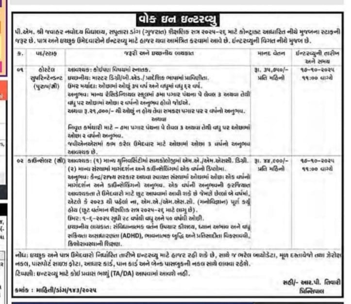 પી.એમ. શ્રી જવાહર નવોદય વિદ્યાલય દ્વારા જાહેરાત માં 04 ઓક્ટોબર 2025 ના રોજ બહાર પાડવામાં આવી છે. આ ભરતી માટે અરજી કરવાની અંતિમ તારીખ 17 ઓક્ટોબર 2025 નિશ્ચિત કરવામાં આવી છે. જો તમે આ શાનદાર તકનો લાભ લઈને ભરતી પ્રક્રિયામાં સામેલ થવા માગતા હો, તો અમારી નમ્ર સલાહ છે કે તમે નિર્ધારિત સમયમર્યાદા પહેલાં તમારી અરજી તૈયાર કરીને સબમિટ કરી દો, કેમ કે એકવાર છેલ્લી તારીખ વીતી ગયા પછી કોઈપણ પ્રકારની અરજીઓને માન્યતા આપવામાં આવશે નહીં.
