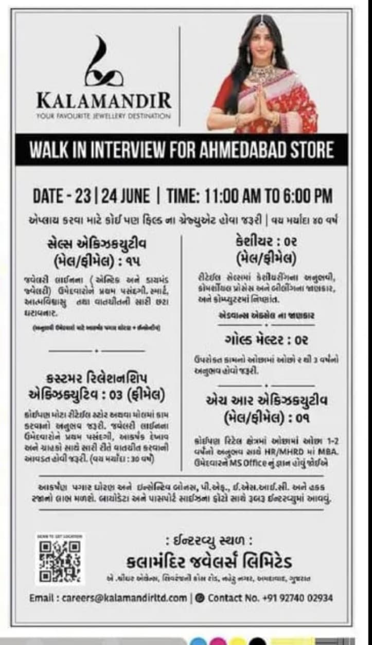 કલામંદિર જવેલર્સ દ્વારા જાહેરાત માં 11 જૂન 2025 ના રોજ બહાર પાડવામાં આવી છે. આ ભરતી માટે અરજી કરવાની અંતિમ તારીખ 24 જૂન 2025 નિશ્ચિત કરવામાં આવી છે. જો તમે આ શાનદાર તકનો લાભ લઈને ભરતી પ્રક્રિયામાં સામેલ થવા માગતા હો, તો અમારી નમ્ર સલાહ છે કે તમે નિર્ધારિત સમયમર્યાદા પહેલાં તમારી અરજી તૈયાર કરીને સબમિટ કરી દો, કેમ કે એકવાર છેલ્લી તારીખ વીતી ગયા પછી કોઈપણ પ્રકારની અરજીઓને માન્યતા આપવામાં આવશે નહીં.