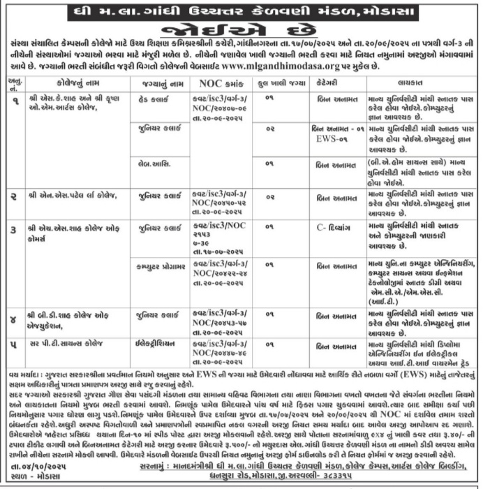 મ.લા. ગાંધી ઉચ્ચત્તર કેળવણી મંડળ ભરતી દ્વારા હેડ કલાર્ક,જુનિયર કલાર્ક,લેબ આસિસ્ટન્ટ,કમ્પ્યુટર પ્રોગ્રામર,ઈલેક્ટ્રીશિયન  ના પદો માટે ભરતી ની પ્રક્રિયા હાલમાં ચાલી રહી છે. આ પદો સાથે સંકળાયેલી વધુ જાણકારી મેળવવા માટે સંસ્થા દ્વારા પ્રસિદ્ધ કરાયેલી સત્તાવાર જાહેરાતને ધ્યાનપૂર્વક વાંચવાની ભલામણ કરવામાં આવે છે.
