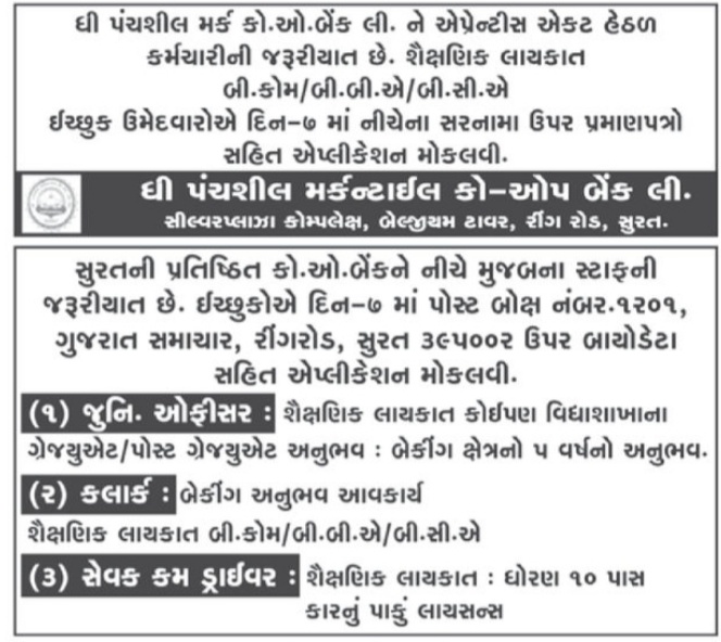 - ધી પંચશીલ મર્કન્ટાઈલ કો.ઓપ. બેંક લિ. ની આ વેકેન્સીમાં આવેદન કરવા માટે તમારે સૌથી પહેલા નીચે આપેલ જાહેરાતનો અભ્યાસ કરવાનો રહેશે અને તમે અરજી કરવાની લાયકાત ધરાવો છો કે નહિ તે ચકાસવાનું રહેશે.