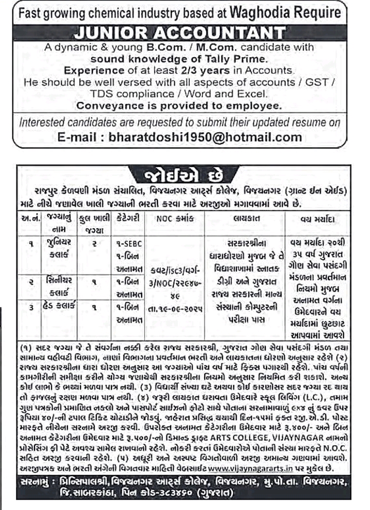 વિજયનગર આર્ટ્સ કોલેજ ભરતી દ્વારા જુનિયર ક્લાર્ક,સિનિયર ક્લાર્ક,હેડ ક્લાર્ક ના પદો માટે ભરતી ની પ્રક્રિયા હાલમાં ચાલી રહી છે. આ પદો સાથે સંકળાયેલી વધુ જાણકારી મેળવવા માટે સંસ્થા દ્વારા પ્રસિદ્ધ કરાયેલી સત્તાવાર જાહેરાતને ધ્યાનપૂર્વક વાંચવાની ભલામણ કરવામાં આવે છે.